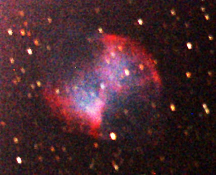 The Dumbbell Nebula (also known as Apple Core Nebula, Messier 27, M 27, or NGC 6853) is a planetary nebula in the constellation Vulpecula, at a distance of about 1,360 light years. This object was the first planetary nebula to be discovered by Charles Messier in 1764. Planetary nebula are shells of gas shed by stars late in their life after using up all of their nuclear fuel. The star then ejects a significant portion of its mass in a gaseous shell, which is illuminated by its extremely hot central star, which is just the core left from the original star. This a normal process for stars in a late period of their life which also our sun will undergo in a few billion years. Planetary nebulae do not last long in cosmic terms, the shell of gas expands and diffuses becoming invisible and the star turns into a white dwarf. Most planetary nebula are bipolar, meaning symmetric with respect to one axis which is thought to be the rotation axis of the original star.